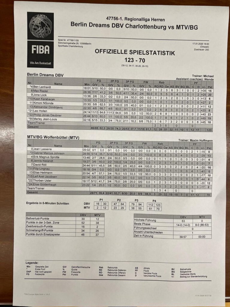 Am Wochenende veranstalteten die Berlin Dreams im Heimspiel gegen Wolfenbüttel das nächste Feuerwerk-Spektakel. Mit dem 17. Sieg aus 17 Spielen bleiben unsere Jungs weiterhin ungeschlagen an der Spitze der Regionalliga Nord. Wie schon etlichen Gegnern zuvor in dieser bislang makellosen Saison hievte auch der MTV/BG Wolfenbüttel schon im Laufe des ersten Viertels die weiße Fahne. Am Ende leuchtete ein eindeutiges 123:70 an der Anzeigetafel.